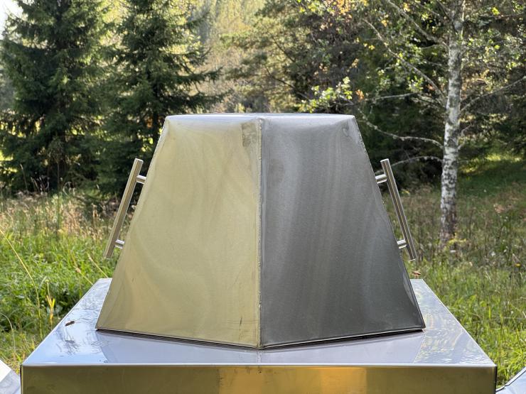 “Wax Studio” is an add-on to be placed on top of the beehive to co-create sculptures together with bees. It consists of insulated steel hood, glass container and beehive cover. To let bees make freeform sculptures, regular cover is replaced with one with a hole on top. Glass container is places on top where bees will have access. The whole thing will be covered by the steel hood to protect from heat and rain.